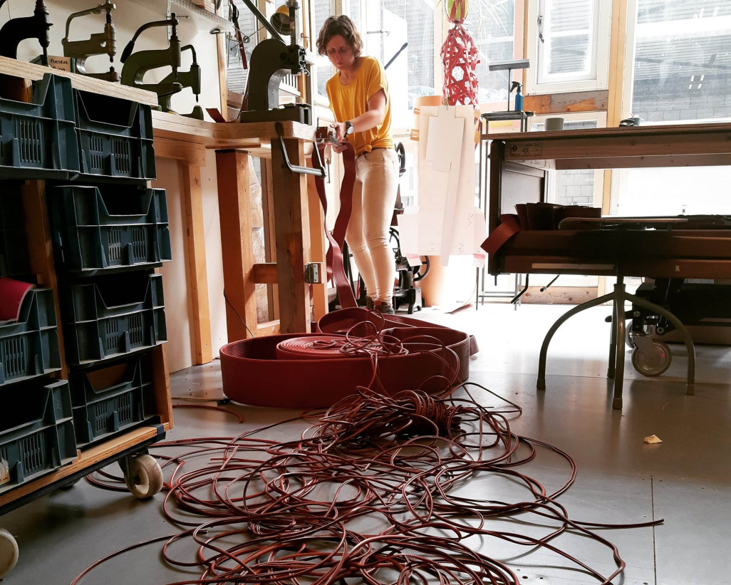 EVERSOM zit in het verzamelgebouw Keilewerf II. Een unieke plek waar verschillende makers hun eigen atelier hebben gebouwd. Zo ook EVERSOM. In 2019 is er met 95% hergebruikte materialen een unieke plek gecreëerd. Hier worden de slangen gesorteerd, gewassen en gesneden, de producten ontworpen en geproduceerd.